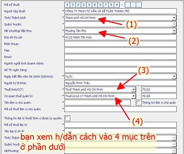 + Bước 2 : nhập thông tin Cty bạn vào PM HTKK. Giả sử sau đây nhập thông tin "Công ty TNHH Tư Vấn và Kế Toán Thanh Trí - MST : 0302683754 - Địa chỉ trụ sở (sau sáp nhập) : 411/2 Kênh Tân Hóa, Phường Tân Phú, TPHCM" . Cách nhập như sau :