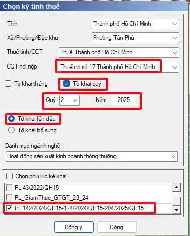 => Xuất hiện bảng sau, bạn chọn các mục như hình minh họa. Lưu ý nếu trong Quý, Cty bạn có xuất hóa đơn VAT bán ra, có giảm thuế từ 10% xuống 8% thì chọn thêm Phụ lục giảm thuế là mục cuối cùng của hình minh họa dưới đây :