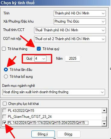 => Xuất hiện bảng sau, bạn chọn các mục như hình minh họa. Lưu ý nếu trong Quý, Cty bạn có xuất hóa đơn VAT bán ra, có giảm thuế từ 10% xuống 8% thì chọn thêm Phụ lục giảm thuế là mục cuối cùng của hình minh họa dưới đây :