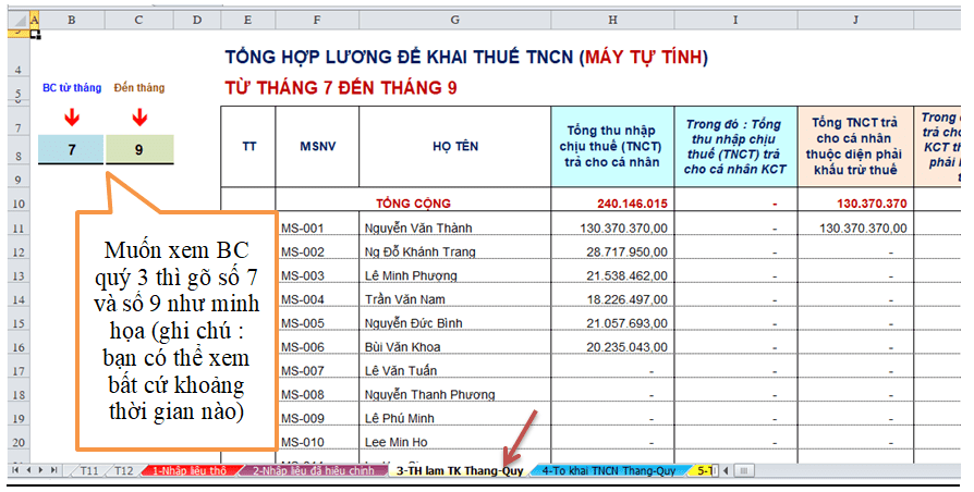- Ví dụ bạn muốn làm “Tờ khai thuế TNCN Quý 3/2022” thì tại Sheet “3-TH lam TK Thang-Quy” bạn gõ số vào ô “BC từ tháng” là số 7 và vào ô “Đến tháng” là số 9, sau đó đi qua Sheet “4-To khai TNCN Thang-Quy” là chúng ta có ngay “Tờ khai thuế TNCN Quý 3/2022” tại “4-To khai TNCN Thang-Quy” (xem hình) (ghi chú : bạn chỉ chuột vào từng ô trên Tờ khai sẽ biết máy lấy dữ liệu từ đâu)