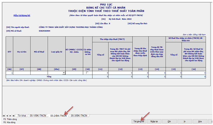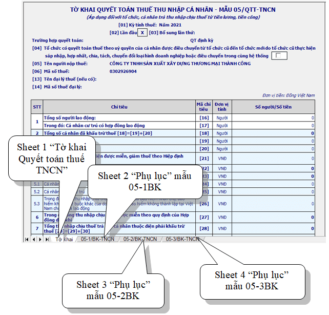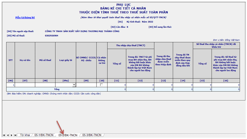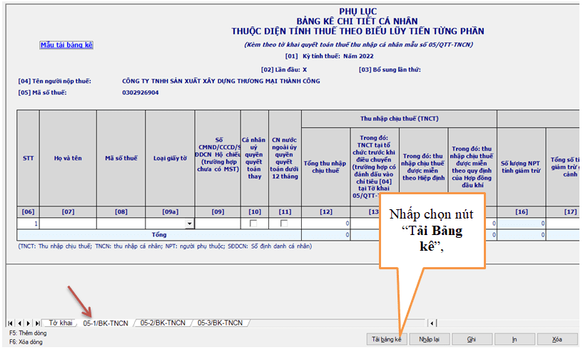 + Tại Sheet 2 “05-1BK-QTT-TNCN” trên phần mềm HTKK
