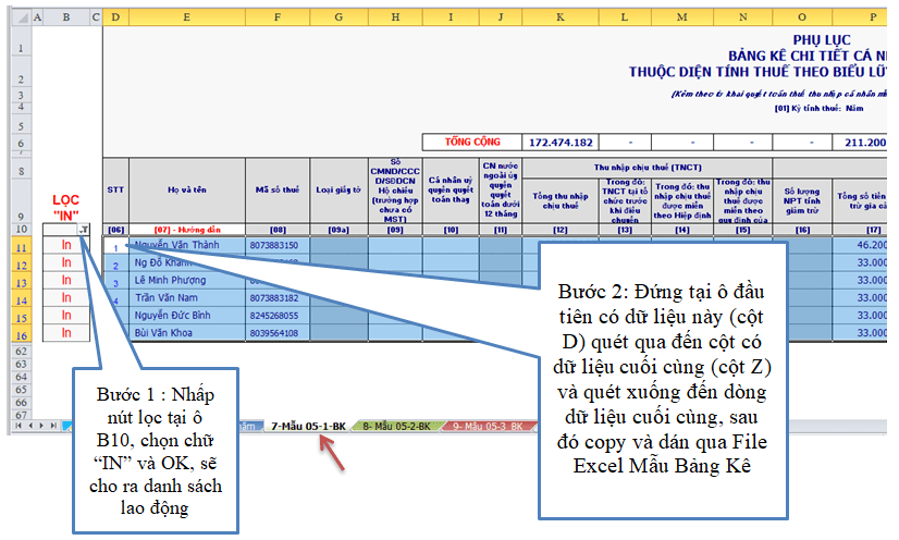 + Để đưa thông tin vào File excel Mẫu Bảng kê trên, Tại File Excel “2-PM tinh Luong va Thue TNCN”, bạn đi đến Sheet “7-Mẫu 05-1-BK”, đi tới nút lọc (nút Filtter) tại ô [B10], lọc ra chữ “IN”, và quét chọn toàn bộ dữ liệu từ dòng có dữ liệu người LĐ đầu tiên đến dòng cuối cùng (quét từ [cột D] qua đến [cột Z] và quét xuống đến người cuối cùng), sau đó copy dữ liệu vừa chọn và dán qua File Excel Mẫu Bảng Kê là xong (đưa chuột vào ô B6 rồi dán vào. Lưu ý quan trọng: phải dán giá trị, không dán bình thường) (xem hình)