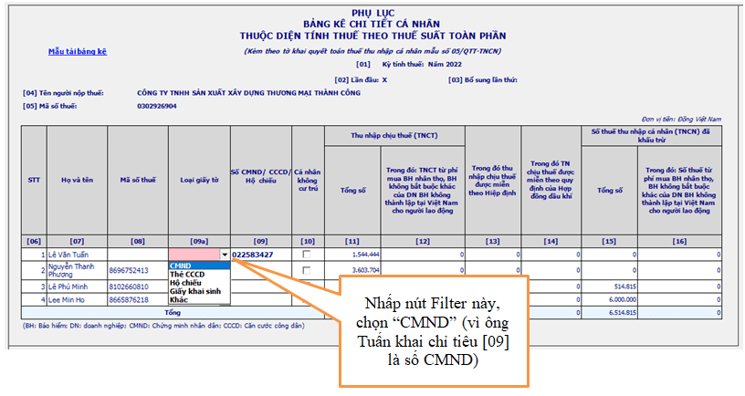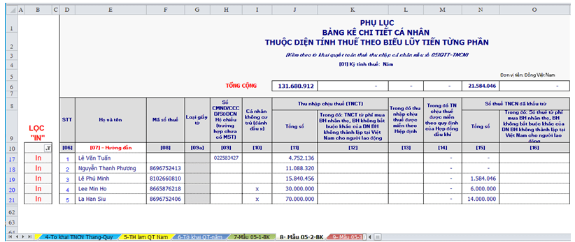 Tại File Excel “2-PM tinh Luong va Thue TNCN”, bạn đi đến Sheet “8-Mẫu 05-2-BK”, đầu tiên bạn đi đến nút Filter tại ô B10, lọc ra chữ “IN” là chúng ta có danh sách các LĐ cần đưa dữ liệu qua PM HTKK. Trong bài này, bạn chỉ copy chỉ tiêu tại các cột [7], [8], [9], [10], [11], [15]). Chỉ tiêu [8] nếu LĐ nào chưa có MST TNCN thì phải nhập số CCCD/CMND/Hộ chiếu vào chỉ tiêu [9], nếu có rồi thì không cần nhập. Chỉ tiêu [10], là copy dấu “X” qua