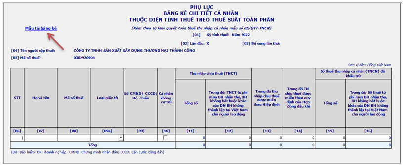 Sau khi bổ sung 2 thông tin trên bạn đi qua Sheet “6-Tờ khai QT-năm”, thì đó là kết quả “Tờ khai Quyết toán thuế TNCN“ năm 2022 của Cty Thành Công