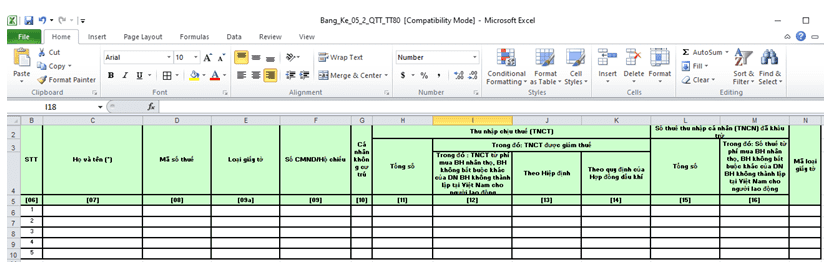 Lưu ý : Bảng này có Mục [08] là : nhập thông tin Mã số thuế TNCN của từng lao động, nếu người này chưa có thì nhập số CMND/ hộ chiếu vào Mục [9]. Tuy nhiên theo qui định thì khi làm Quyết toán thuế TNCN năm các bạn phải lấy thông tin MST Thu nhập cá nhân để điền vào cột [8], nếu cá nhân đó chưa có MST thu nhập cá nhân, bạn phải đăng ký MST cho họ tối thiểu trước 10 ngày tính đến ngày Cty nộp Quyết toán thuế TNCN (Gợi ý : qui định là vậy, nhưng các bạn nên đăng ký MST cho người LĐ (nếu họ chưa có) ngay khi họ mới vào làm Cty, vì sau này nếu gặp cơ quan thuế khó họ có thể xem xét lại thời gian đăng ký MST)