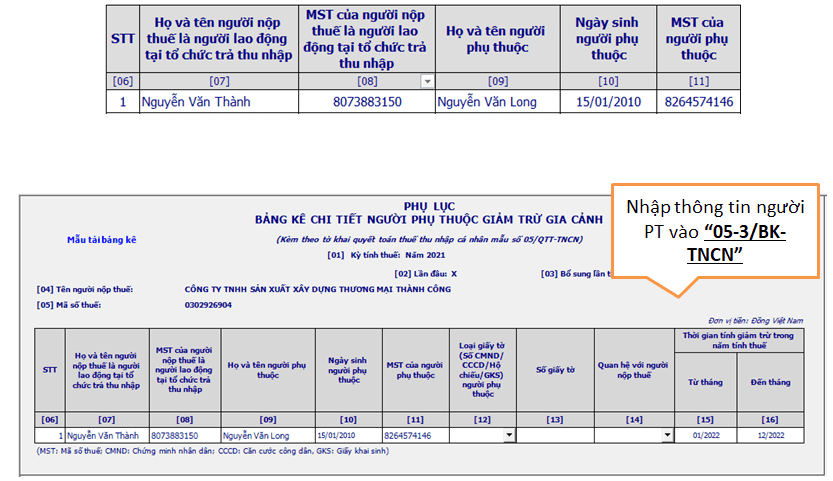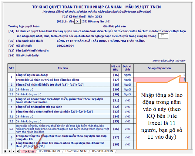 ▶ Thông tin thứ nhất : Giả sử trong năm 2022 cả Cty chỉ có ông Thành đăng ký nuôi 01 người phụ thuộc (là con ông Thành), bạn nhập thông tin này vào sheet [9- Mẫu 05-3-BK]