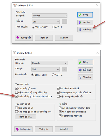 ► Cách 1 : bạn mở Phần mềm Unikey lên, chọn “Mở rộng”, sau đó tích chọn “Luôn sử dụng clipboard cho Unicode” là xong (xem hình)