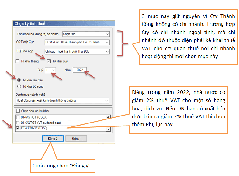 + Xuất hiện bảng sau, bạn chọn các mục có mũi tên như hình minh họa. Lưu ý năm 2022, do ảnh hưởng dịch bệnh nên nhà nước có giảm thuế VAT một số mặt hàng để kích cầu, nên bạn chọn thêm mục "PL 43/2022" (lưu ý sang năm 2023 , nhà nước đang họp để tiếp tục thực hiện vấn đề giảm thuế này, nhưng có thể bắt đầu thực hiện từ tháng 07/2023) :