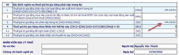 + Sau khi hoàn thành thì kết quả tại chỉ tiêu [40] trên “Tờ khai thuế GTGT” là số thuế VAT Quý 1/2022 Cty phải nộp : 144.118.511 đ (xem hình)