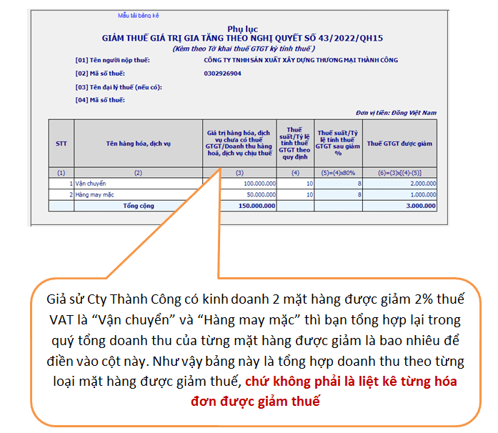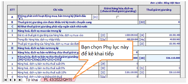 + Sau khi kê khai xong “Tờ khai thuế GTGT”, bạn đi qua bảng Phụ lục “PL 43/2022/QH15” để kê khai các mặt hàng được giảm 2% thuế VAT (nếu Cty bạn không có giảm 2% VAT thì bỏ qua bước này)