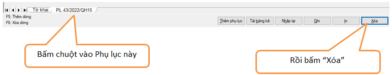 + Trên đây chỉ là giả sử Cty Thành Công có kinh doanh mặt hàng được giảm thuế để minh họa cho bạn biết cách làm bảng Phụ lục, thực tế thì Cty này không KD mặt hàng giảm thuế nên bạn phải xóa Phụ lục này trên PM HTKK đi thì máy mới cho kết quả đúng. Cách xóa Phụ lục là bạn nhấp chuột vào sheet “PL 43/2022/QH15” và bấm nút “Xóa”