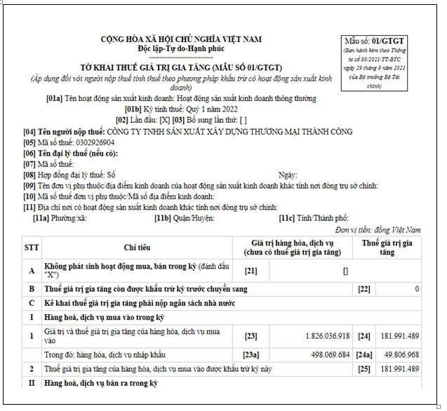 + Chỉ tiêu [22] "Thuế GTGT còn được khấu trừ kỳ trước chuyển sang", nghĩa là Quý trước nếu Cty bạn còn số thuế VAT đầu vào chưa khấu trừ hết thì bạn sẽ chuyển số đó qua Quý này khấu trừ tiếp. Cách làm là : bạn mở Tờ khai VAT quý trước (Quý 4/2021) ra xem Thuế VAT Quý trước có còn được khấu trừ chuyển quý sau không (xem trên chỉ tiêu [43]), nếu còn thì gõ vào chỉ tiêu [22] này. Trường hợp Cty Thành Công theo đề bài thì không còn, nên chỉ tiêu [22] là bằng 0
