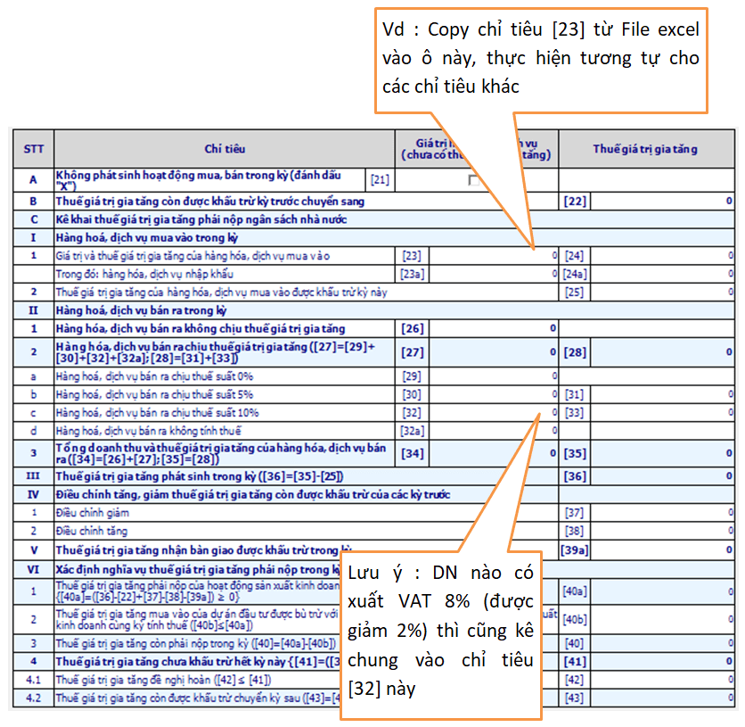 + Chỉ tiêu [23a] và [24a] lấy từ "Sheet 1-Dau vao" (Bảng kê hóa đơn mua vào), số liệu là các chứng từ có liên quan đến hàng nhập khẩu từ nước ngoài (nếu Cty bạn không có nhập hàng từ nước ngoài thì 2 chỉ tiêu này = 0)
