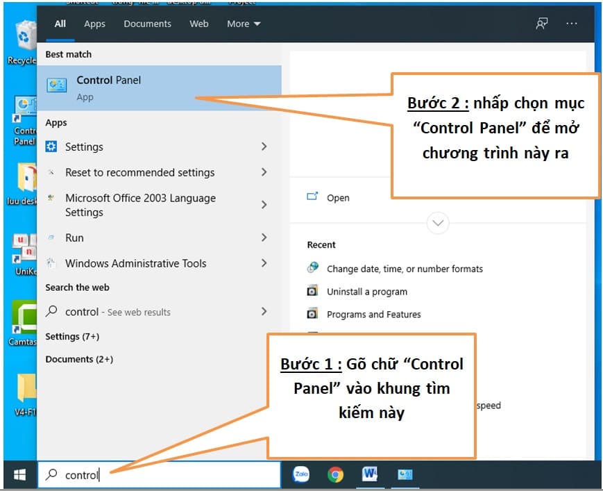 Đối với máy cài Win 10, thì ngoài màn hình Desktop, gõ Control Panel vào thanh tìm kiếm, sau đó nhấp chọn dòng Control Panel xuất hiện trên màn hình