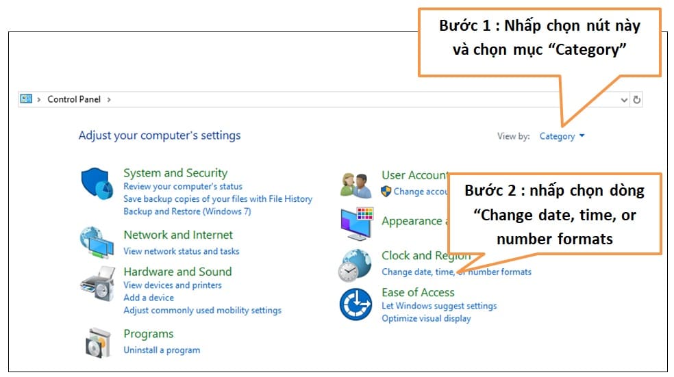 + Nhấp nút chọn tại mục “View by” (xem hình dưới) và chọn “Category” sẽ xuất hiện bảng sau :