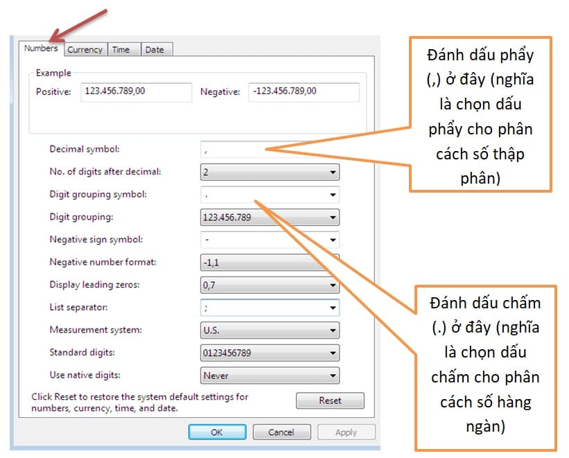 Việc định dạng số được thực hiện trong chương trình Control Panel của máy tính. Cách thực hiện như sau :