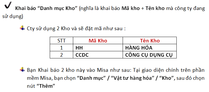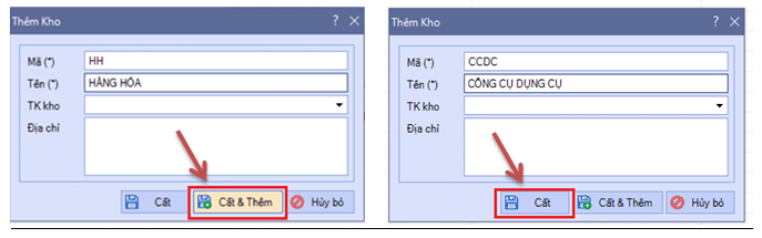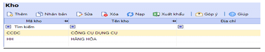 + Bạn lần lượt tạo 2 Kho (HH và CCDC) Cty sử dụng như hình minh họa bên dưới: