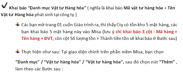 Các bạn mở trang 1 cuốn Giáo trình học kế toán trên PM Misa (đã hướng dẫn các bạn tải về trong bài học Phần 1) để khai báo số dư của các Tài khoản và Hàng tồn kho đầu năm vào PM Misa
