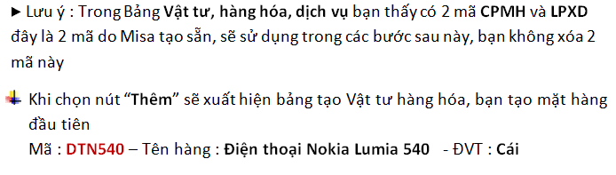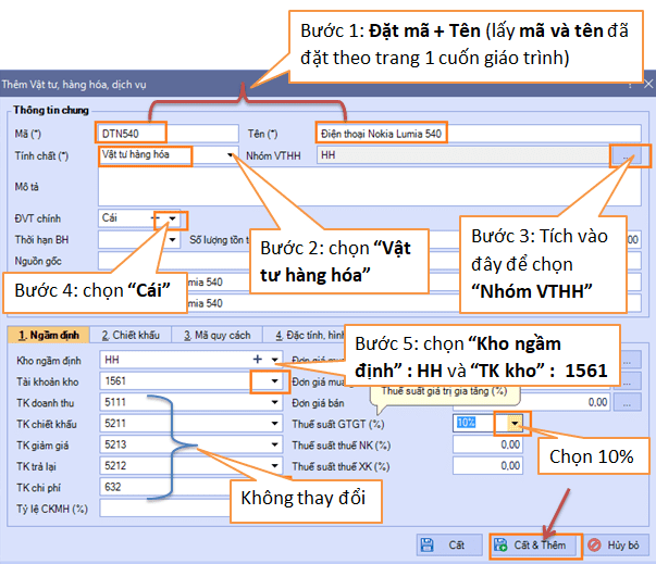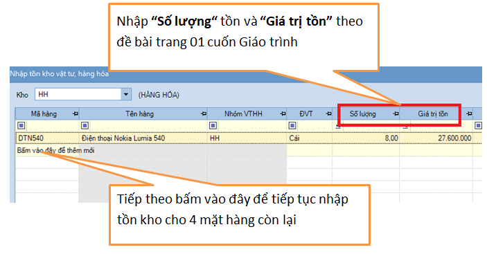 + Khai báo xong mặt hàng này, các bạn chọn nút “Cất &Thêm” để khai báo tiếp 4 mặt hàng còn lại (trên trang 01 cuốn Giáo trình) (lưu ý : Số lượng tồn + Thành tiền tồn kho sẽ khai báo ở Bước sau)