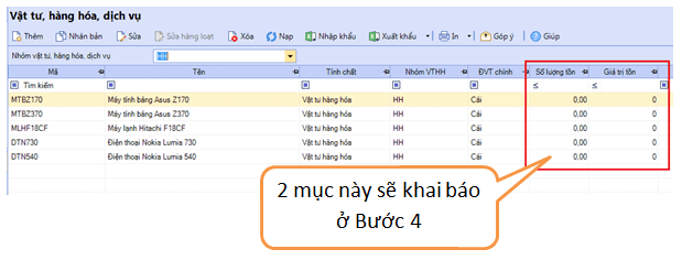 + Sau khi khai báo thành công 5 mặt hàng tồn kho Cty, bạn tiến hành qua Bước 4 “Khai báo tồn kho vật tư hàng hóa”