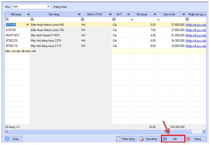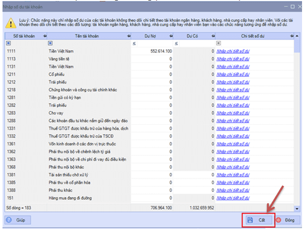 + Sau khi khai bao số dư ban đầu vật tư hàng hóa bạn Bấm chọn “Cất” như hình bên dưới: