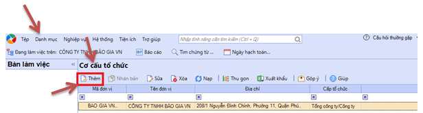 + Các bạn khai báo 02 bộ phận trên vào Misa. Thực hiện như sau: Tại giao diện chính trên phần mềm Misa, bạn chọn “Danh mục” / “Cơ cấu tổ chức”, sau đó chọn nút “Thêm”