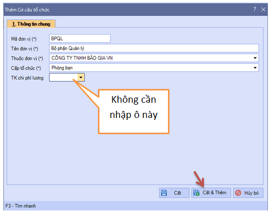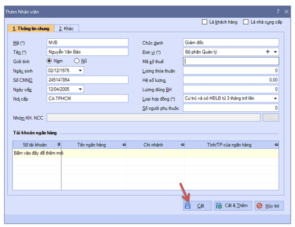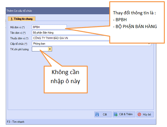 + Điền thông tin đầy đủ như hình, sau đó “Cất & Thêm”, thực hiện tiếp cho BPBH