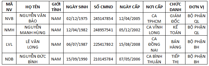 + Bạn tiến hành nhập tất cả danh sách 4 nhân sự Cty Bảo Gia theo mẫu minh họa (các ô để trống là không cần nhập)