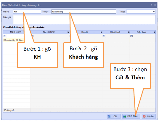 + Khi chọn “Cất & Thêm” thì bạn khai báo tương tự cho Nhóm Nhà cung cấp (lưu ý : nếu bạn chọn nút “Cất”, thì để khai báo Nhóm thứ 2 thì bạn phải vào lại “Danh mục” / “Đối tượng” / “Nhóm khách hàng, nhà cung cấp”). Đặt Nhóm thứ 2 như sau :