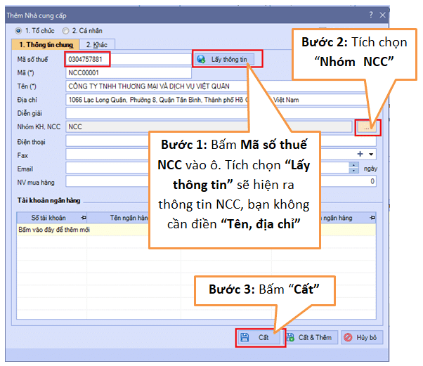 + Trên đây là nhập mẫu một Nhà cung cấp, sau này khi làm sổ sách kế toán khi đến nghiệp vụ nào có phát sinh Nhà cung cấp mới thì các bạn khai báo Nhà cung cấp đó như vừa hướng dẫn