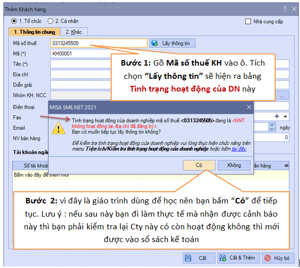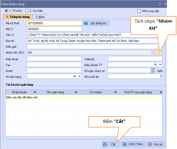 + Tiếp theo chọn “Nhóm KH, NCC” là KH như hình minh họa, nếu không cần gõ các chi tiết khác thì bấm “Cất” là khai báo xong khách hàng này (lưu ý : khi bấm “Cất” máy sẽ hỏi lại DN này không còn hoạt động tại địa chỉ này, bạn có muốn Cất không. Vì đây là hóa đơn minh họa dùng để học tập nên bạn bấm “Cất”)