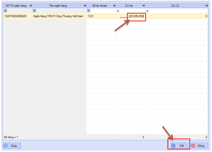 Ví dụ: Nhấp đúp vào dòng TK 1111 => nhập số dư vào, và trên giao diện này nhập tiếp số dư các TK khác. Riêng số dư TK 1121 thì không nhập trên giao diện này, các bạn “Cất”, sau đó ra ngoài chọn 1121 để nhập số dư ngân hàng (xem hình minh họa)