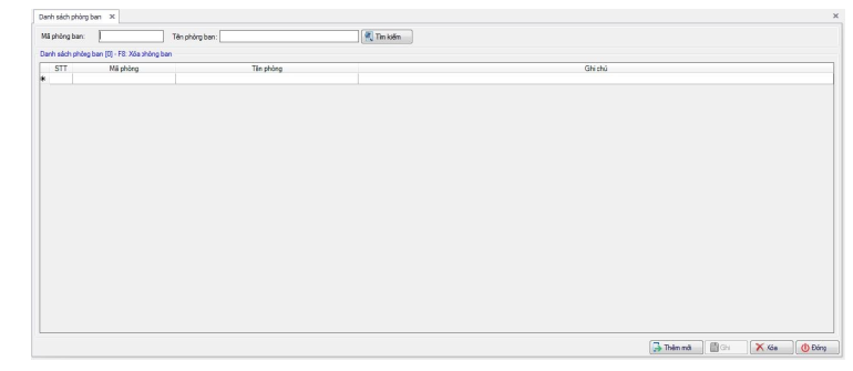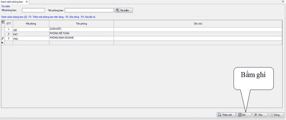 ► Bạn nhập Mã phòng, Tên phòng, Ghi chú vào các cột tương ứng. Sau đó bấm nút Ghi để ghi nhận lại các thông tin vừa nhập.