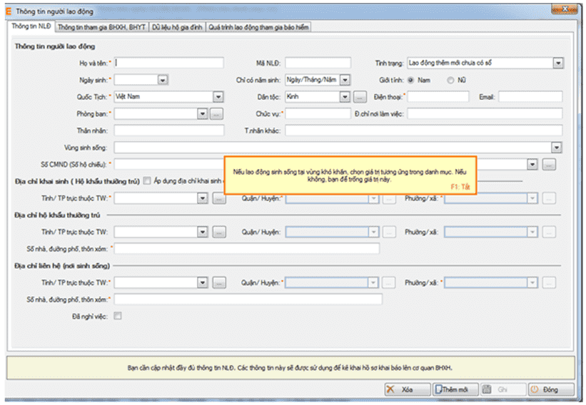 ► Muốn nhập người lao động mới, kích nút Thêm mới để hiển thị Form thông tin ban đầu.