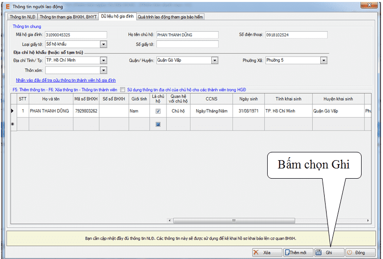 ► Trong phần này ta cần nhập đầy đủ tên chủ hộ gia đình. Sau đó bấm Ghi để lưu lại các thông tin cập nhật.