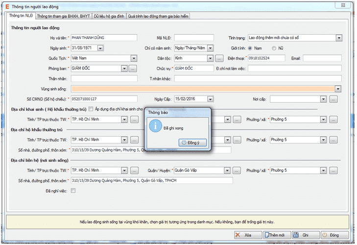 ► Màn hình hiển thị thông báo ghi thành công thông tin của người lao động đó:
